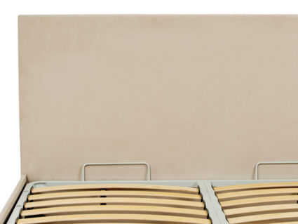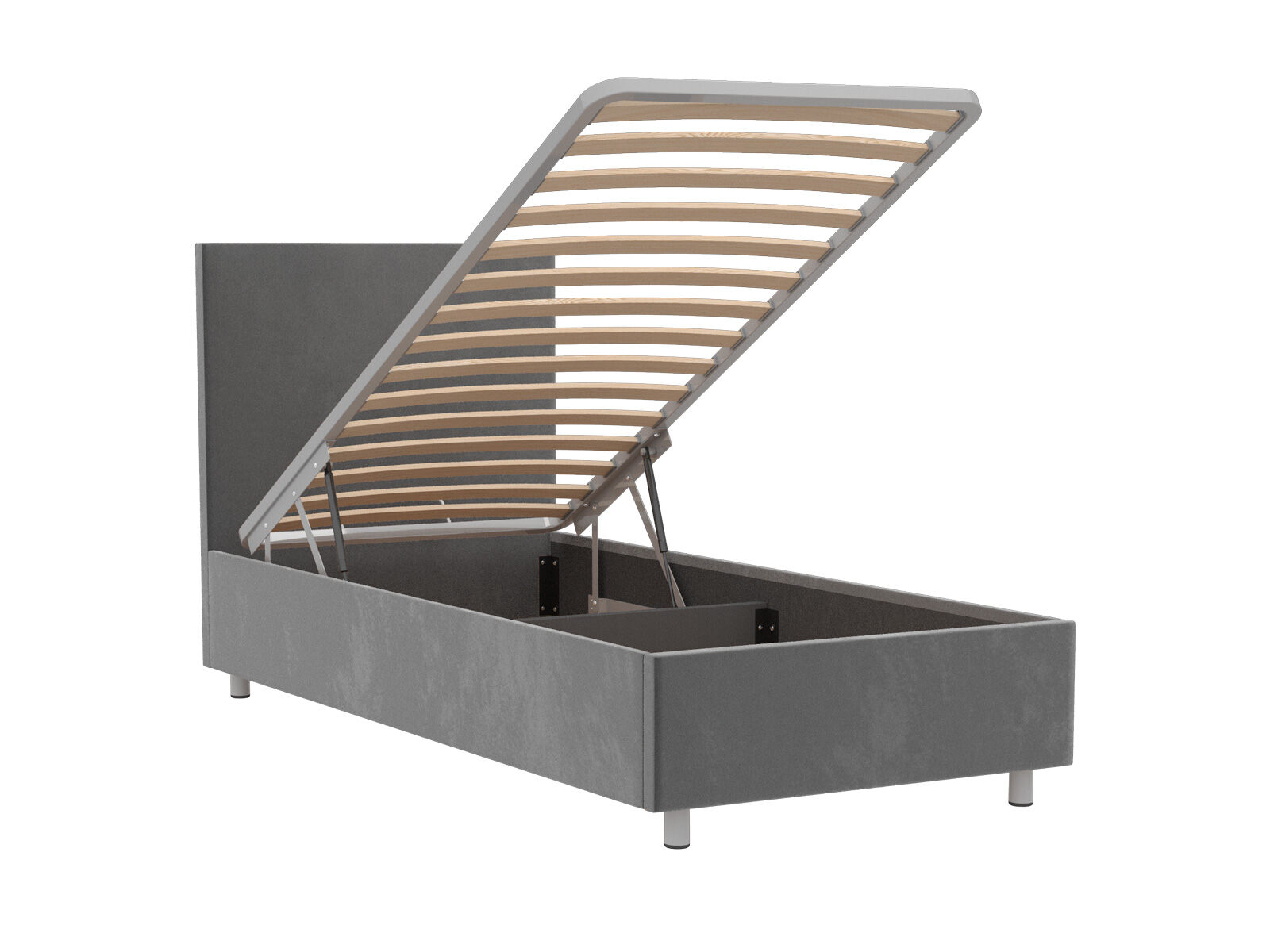 Кровать оснащена основанием с подъемным механизмом, под которым располагается бельевой ящик глубиной 16 см. Рекомендуемая высота матраса от 13 см, вес матраса до 50 кг. Чехлы на царгах несъемные. Высота/толщина царг: 28 см / 4 см (средняя), 2 см - (боковые).