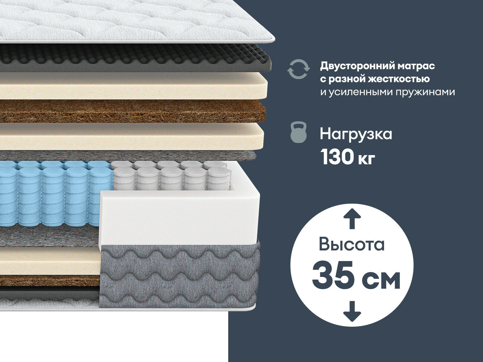 Многослойная система матраса адаптируется под ваш вес и позу сна, сочетая массажный эффект, ортопедическую жесткость и премиальный комфорт.