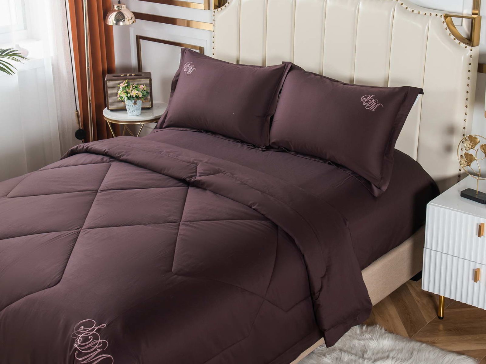 Элегантные комплекты постельного белья с одеялом премиум класса из нежной, натуральной ткани макосатин Нельсон. Этот материал обладает рядом важных качеств: он прочный, но мягкий, гладкая поверхность придает постельному белью красивый внешний вид. Натуральная ткань не вызывает аллергии и раздражения, такое постельное белье приятно использовать в любое время года, и в жару, и в холод.