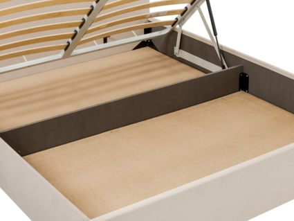 Кровать оснащена подъемным основанием с ламелями, под которым находится вместительный ящик для хранения. Рекомендуемая высота матраса от 13 см, вес матраса до 50 кг.