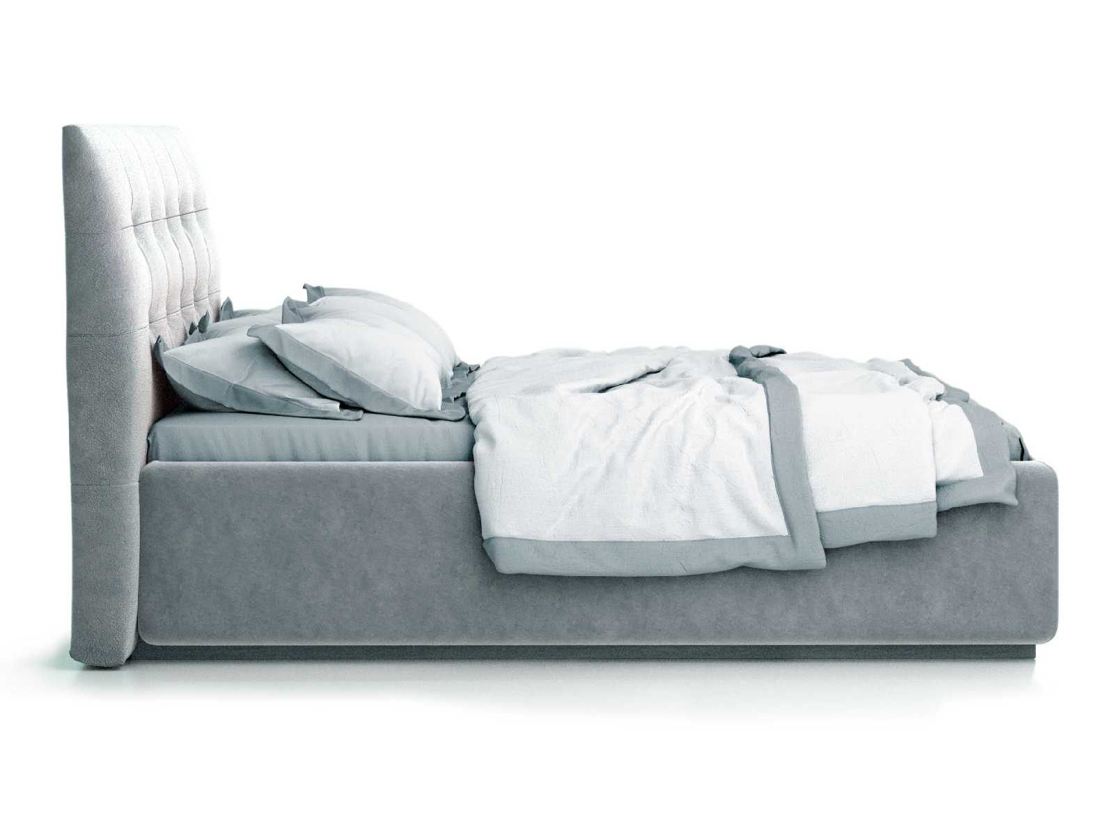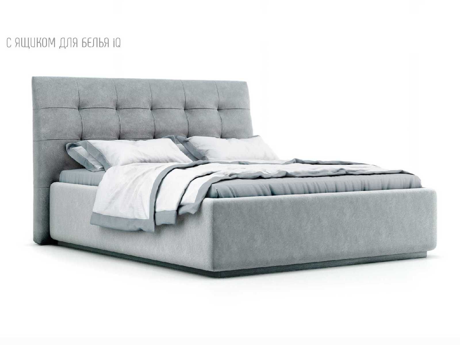 Кровать укомплектована IQ с подъемным механизмом и ящиком для белья без дна (дополнительная платная опция - дно к ящику IQ из HDF (ХДФ). Каркас кровати на цоколе, декоративный чехол на цоколе съёмный. Глубина ящика для белья - 30 см, без ограничения нагрузки на ящик.