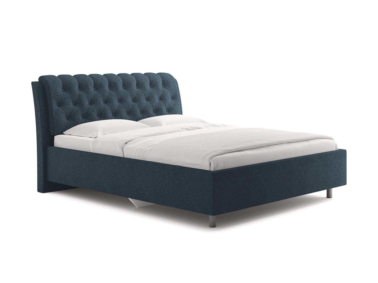 Элегантная интерьерная кровать с изголовьем, украшенным декоративными пуговицами и глубокой пиковкой. Модель изготовлена из ДСП.