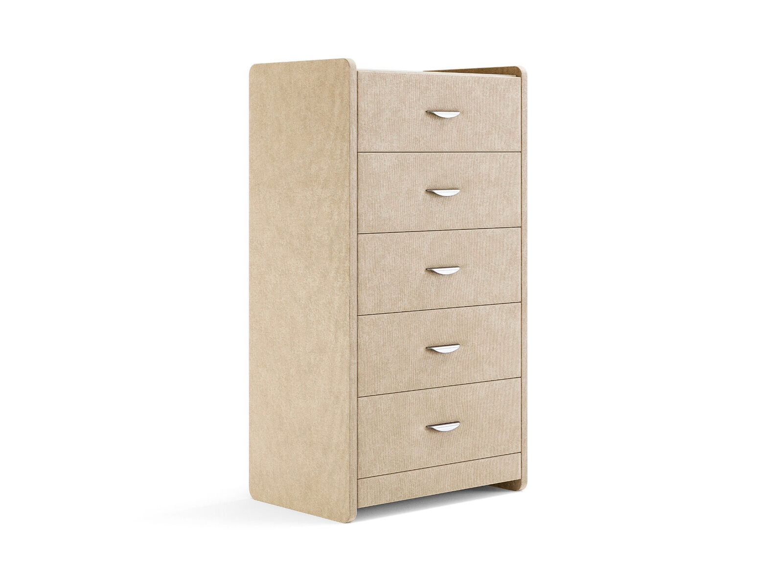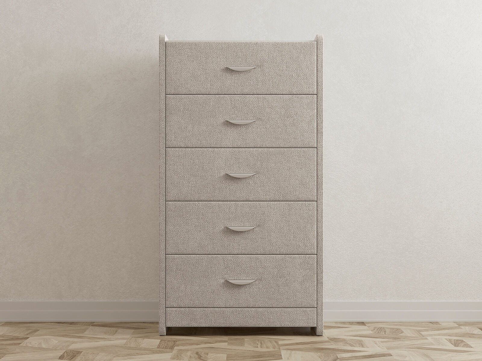 Комод с 5 ящиками сдержанного дизайна дополнит любой интерьер и сделает его более функциональным. Каркас комода и фасад ящиков покрыты обивочным материалом и выполняется в 43 вариантах цветового исполнения. Для удобства использования и продления срока эксплуатации, рекомендуется использовать стеклянную накладку. Накладка используется в качестве столешницы для тумбы и защищает ее от повреждений и загрязнений. Стеклянная столешница заказывается дополнительно.