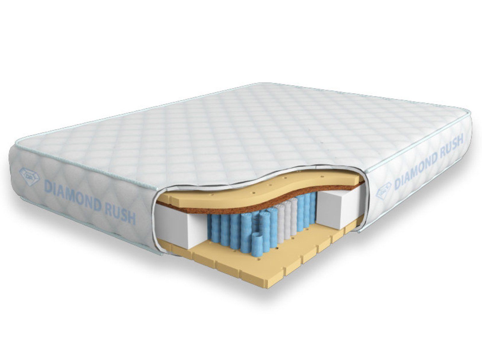 Матрас из серии Luxury Diamond имеет в своей основе независимый пружинный блок MultiZone, состоящий из пружин диаметром 3-4 см разной жесткости. В качестве настилочных слоев поверх пружинного блока используются листовой натуральный латекс с перфорацией и латексированная кокосовая койра. Стороны матраса различаются по жесткости. Одна сторона мягкая, другая среднежесткая.