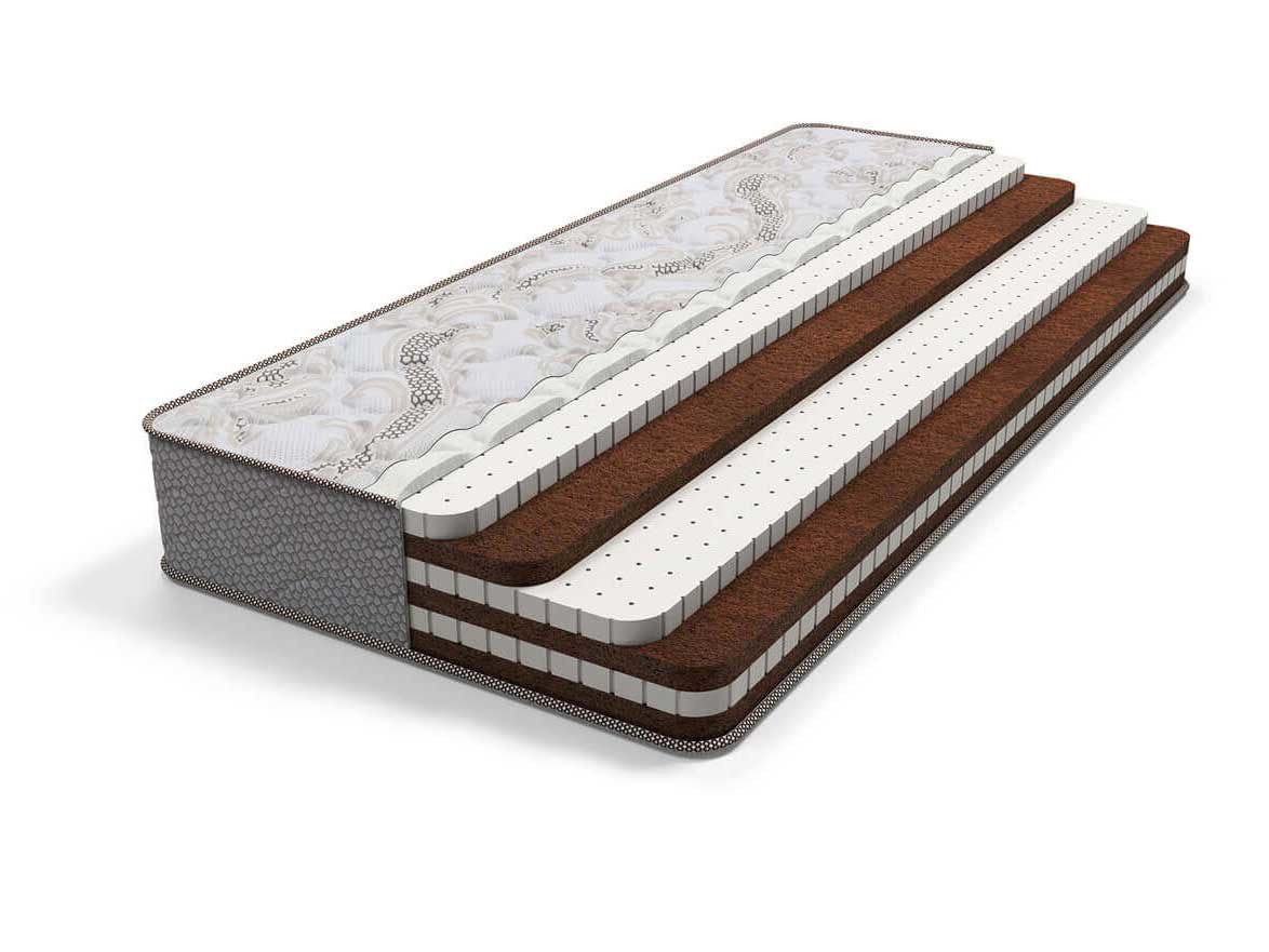 Матрас латекс кокос с разной жесткостью сторон на основе чередующихся слоев натурального перфорированного латекса и латексированной кокосовой койры. Благодаря такому составу матрас обеспечит здоровый и комфортный сон. Одна сторона матраса латекс кокос – жесткая, а другая – средней жесткости.