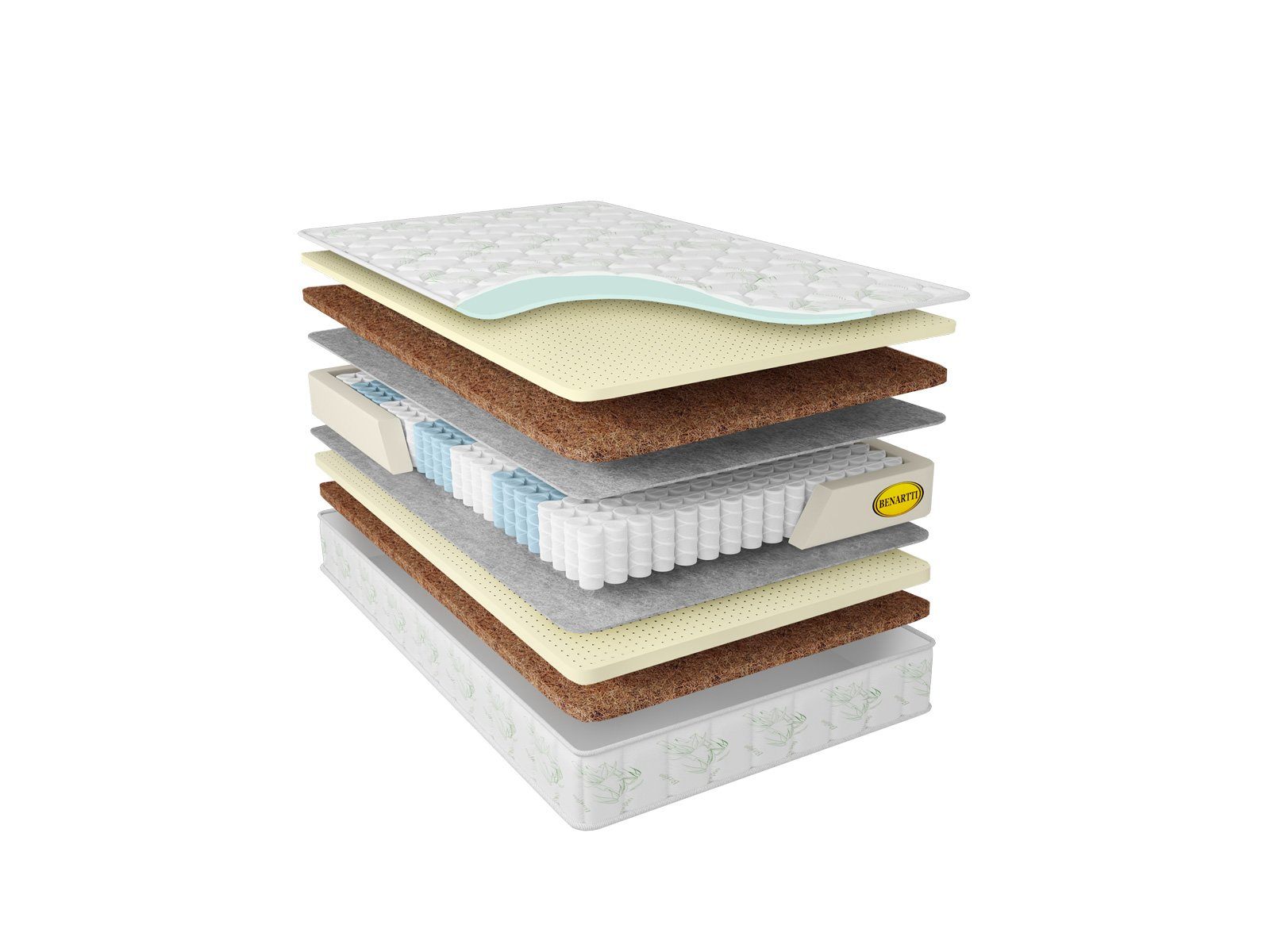 У матраса две стороны жёсткости – средняя и выше среднего. Они обеспечиваются тандемом из койры и латекса, которые расположены сверху и снизу от пружинного блока. Более мягкая сторона представлена у поверхности натуральным латексом, а жёсткая – койрой кокоса. Как правило эти наполнители часто объединены, поскольку они отлично дополняют свойства друг друга. Койра обеспечивает поддержку для спины, а латекс отвечает за комфорт.