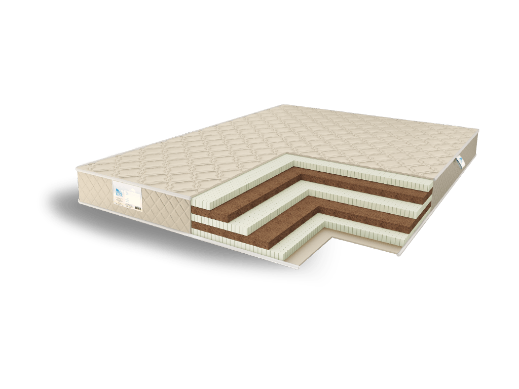Матрас состоит из пяти слоёв, чередующихся между собой койры кокоса и натурального латекса. Толщина каждой плиты – 3 см, таким образом общая высота матраса достигает 15 см. Поскольку каждый материал обладает собственными уникальными свойствами, то вместе они создают союз, который сумел объединить всё лучшее в одной модели.