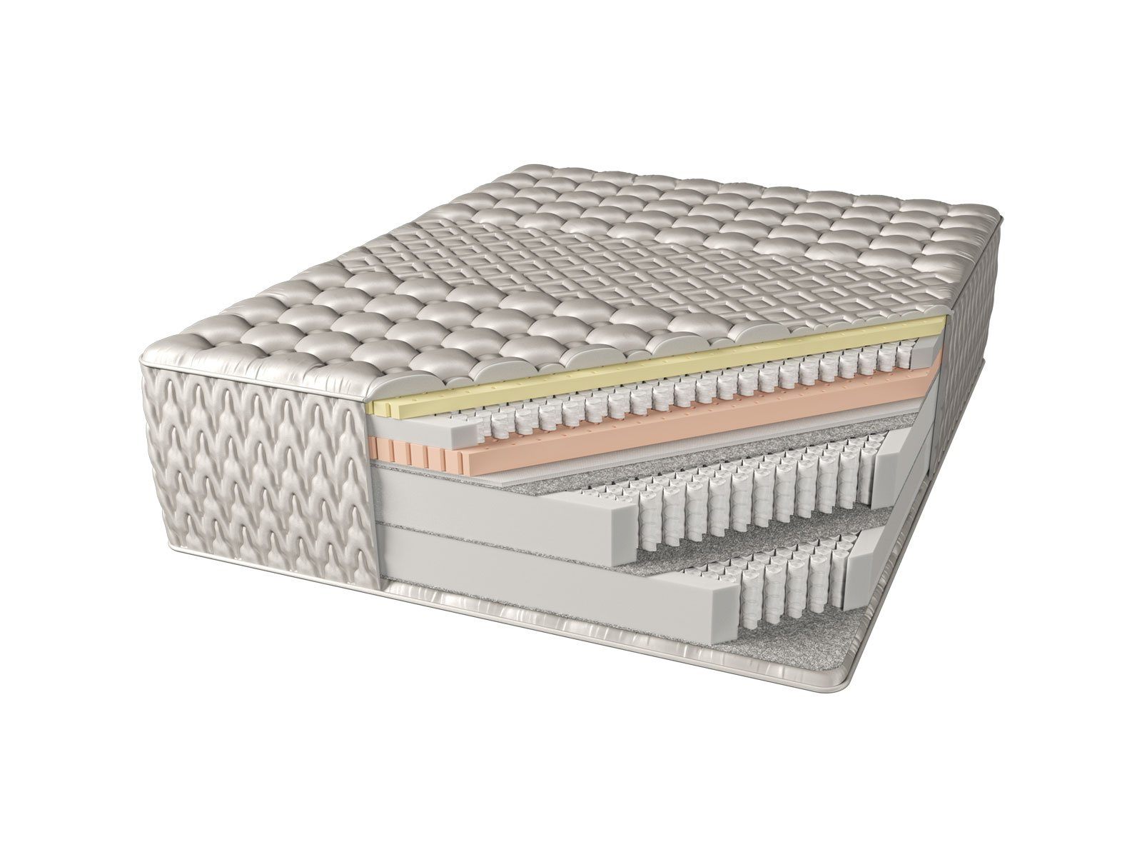 Стеганный чехол матраса и основания из жаккардовой ткани – 55% вискоза, 45% хлопок. Объемный дизайн стежки обеспечивает дополнительный комфорт во время сна. Технология объемной стежки полностью устраняет эффект проваливания, гарантируя спокойный здоровый сон и максимально комфортные ощущения.