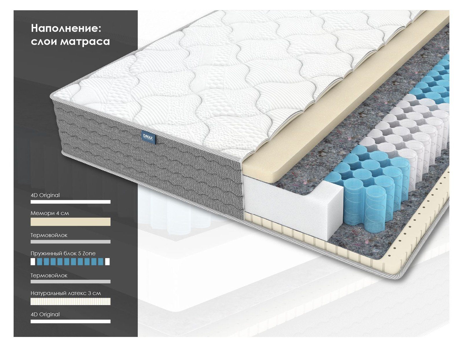 Матрас сочетает самую деликатную поддержку пены Мемори, эластичность латекса и продуманную зонированную систему пружин. Модель — идеальный выбор для тех, кто ценит мягкое спальное место, без компромисса в ортопедическом эффекте, и хочет быстро восстанавливаться во время сна.