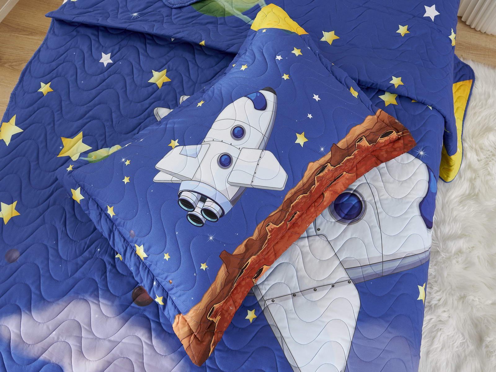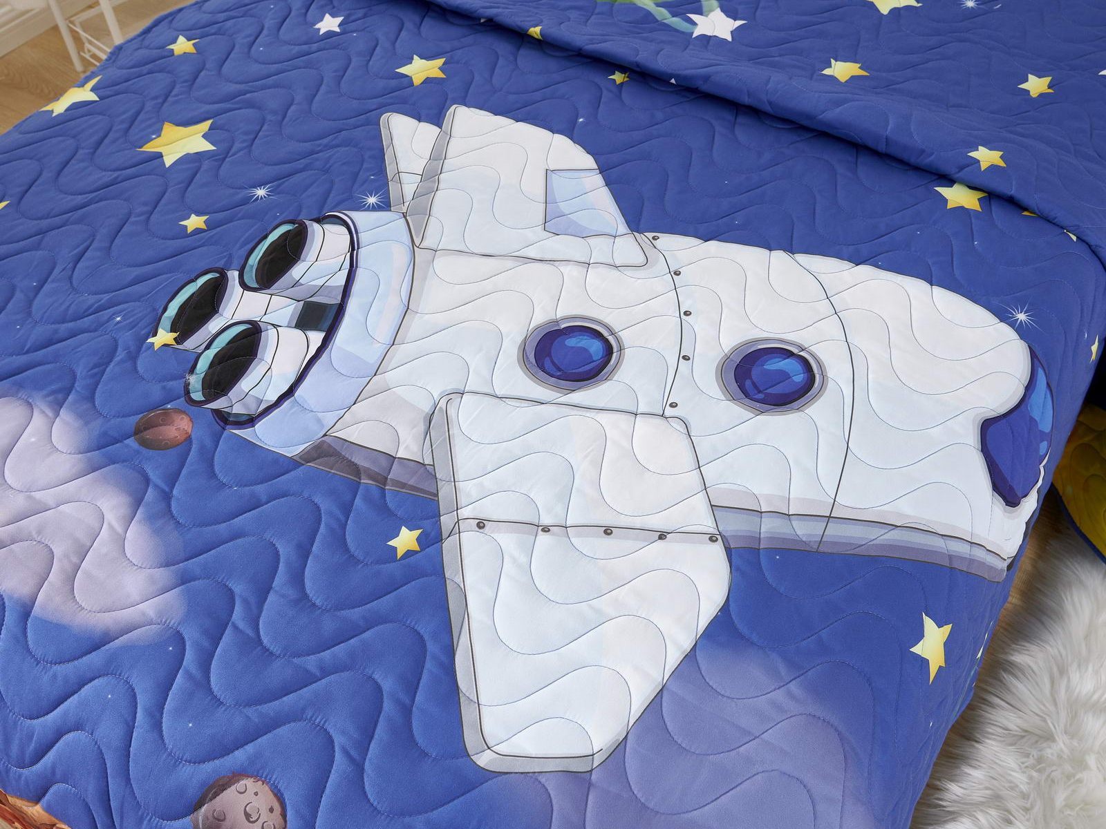Покрывала коллекции «Sunny day» не только украшают комнату, но и защищают постель от грязи и пыли. А если маленькому хозяину станет холодно, теплое покрывало согреет его. Покрывала сделаны из хлопка и вискозы, хлопок хорошо согревает, а вискоза помогает изделию держать форму.
