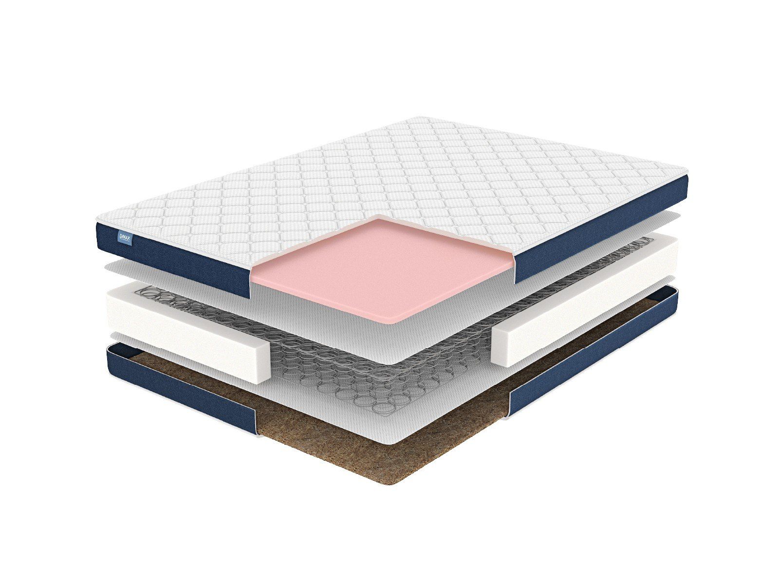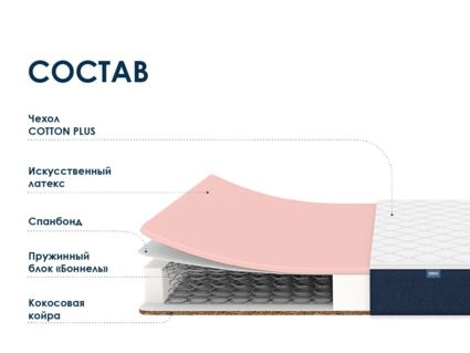 Между ортопедической пеной и кокосом установлен пружинный блок «Боннель». Он представляет собой пружины, сцепленные особым образом. Благодаря такому соединению они не скрипят и работают связанно. Нагрузка на матрас равномерно распределяется блоком. Как результат – модель выдерживает вес до 100 кг на спальное место.